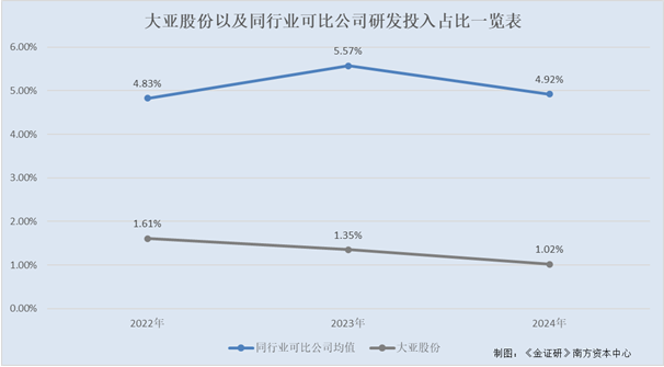 由上可知,2023-2024年大亚股份的研发投入金额逐年降低,且2022-2024年,大亚股份的研发投入占比连续三年低于三家境内可比公司。